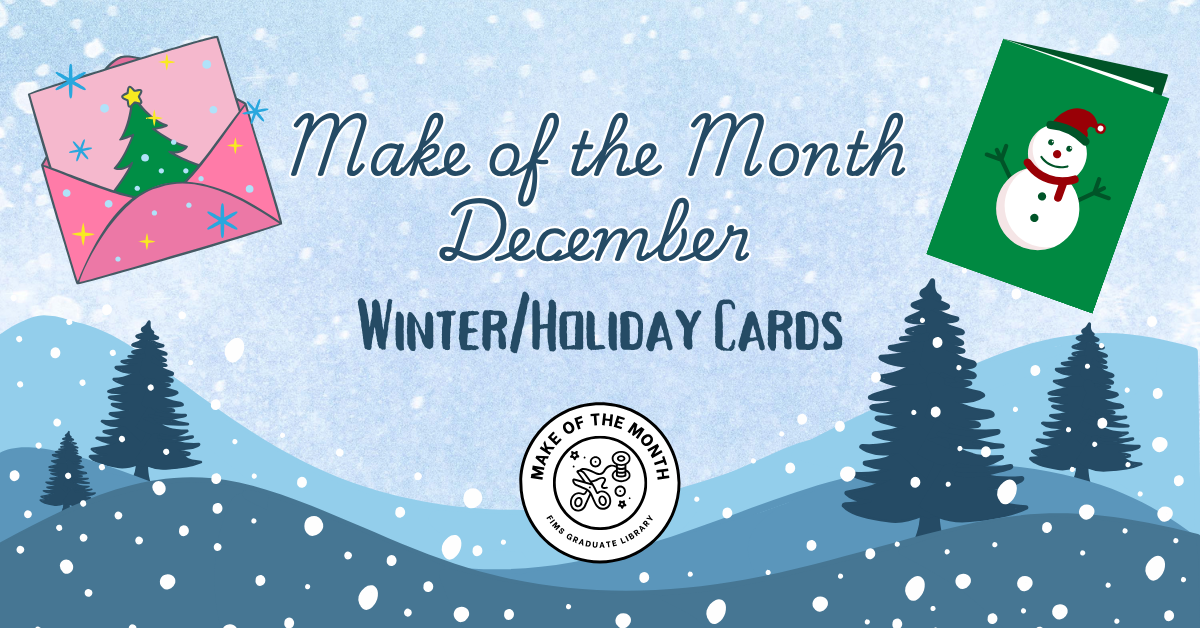 This month we’re putting the CricutTM from our Makerspace to good use and making winter and holiday-themed cards. When you next need a break from your coursework or research, visit us in the Library to put your creativity (and crafting skills) to good use. We supply the materials, and even a few pre-cut designs to make and take. Themes include winter wonderland, happy holidays, Christmas, Hannukah, Kwanza and more. If the pre-cut cards aren’t your style, browse the large catalogue of cards that can be cut from the Cricut in ten minutes or less! We’ll show you how.
